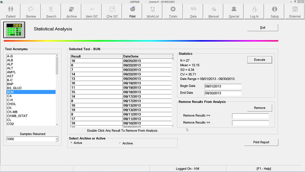 You can select options such as the number of samples, begin date, end date and selecting, if necessary, which results you may wish to remove before running your statistical data report.