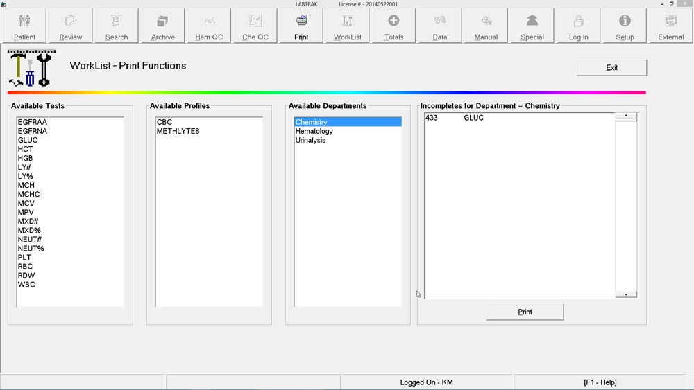 Test “Work Lists” can be printed at any time by “Test”, “Profile” or by “Department”.